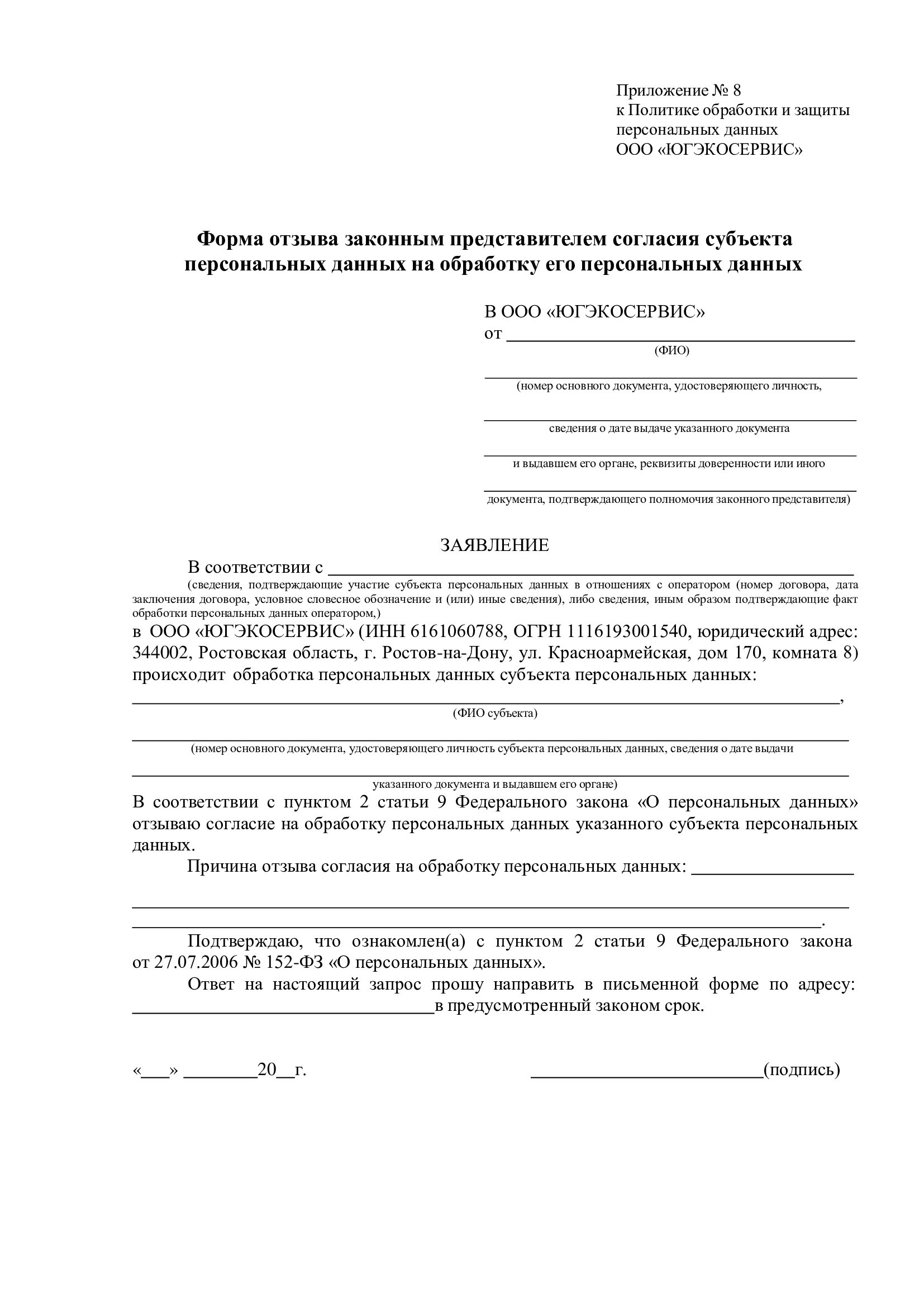 1.4.5. Субъект персональных данных имеет право обжаловать действия либо бездействие Общества, обратившись в уполномоченный орган по защите прав субъектов персональных данных (территориальное подразделение Роскомнадзора).